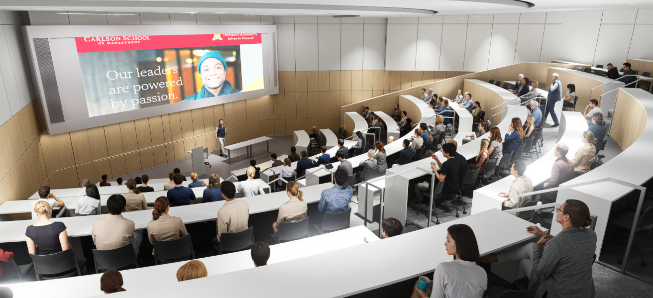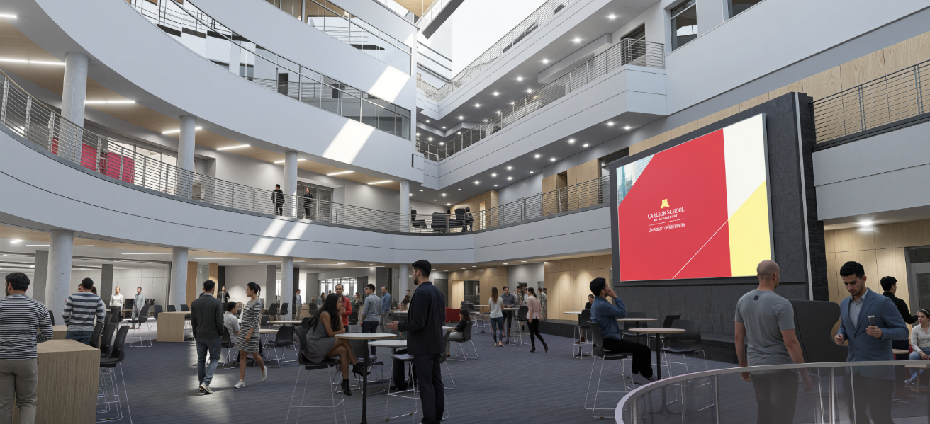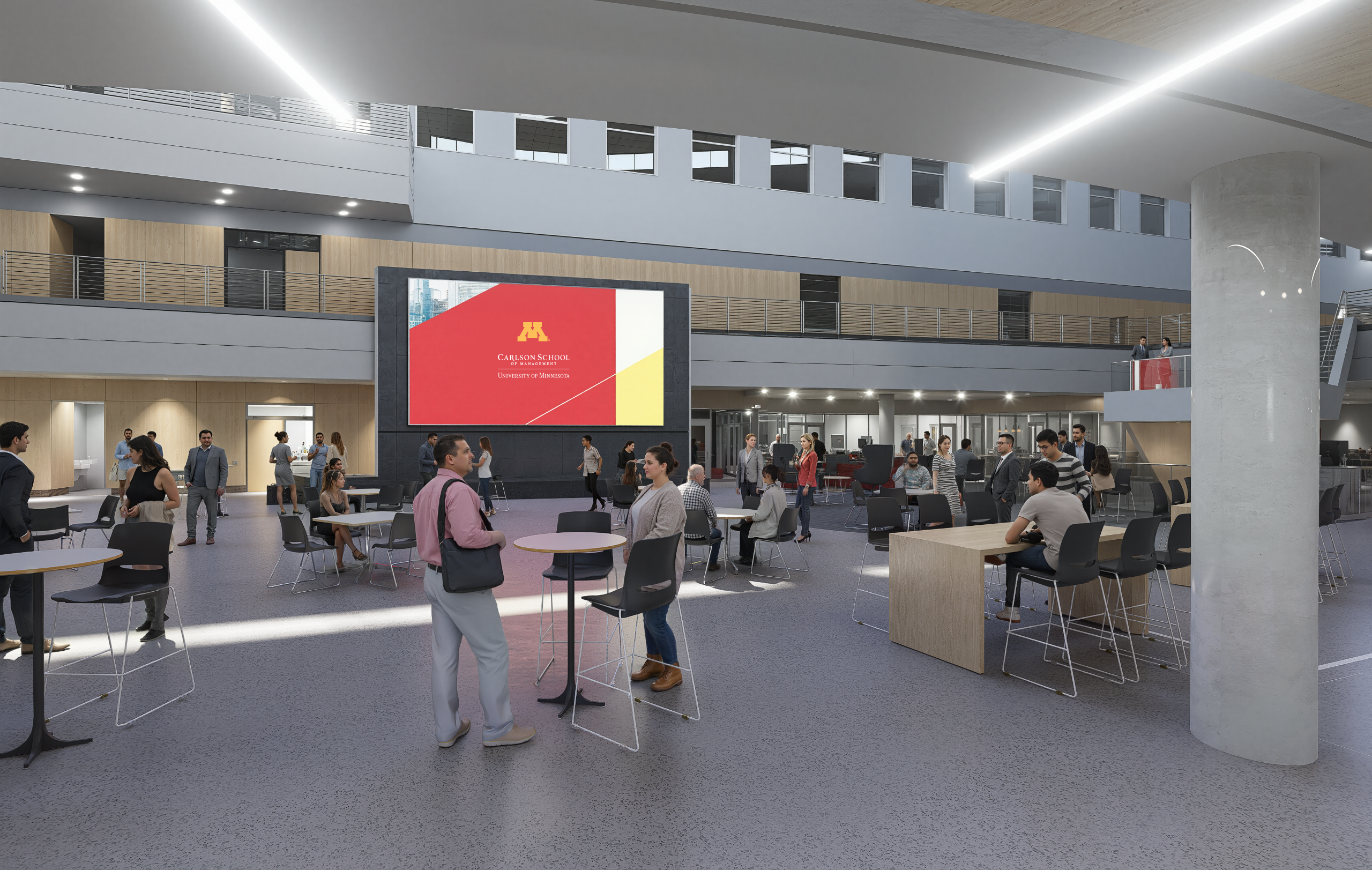 Project revitalizes prominent spaces throughout Marilyn Carlson Nelson Hall; renovated atrium and primary auditorium; new Enterprise Labs suite; relocated and expanded Carlson Analytics Lab; refreshed classrooms and study spaces; new roof; modernization of the atrium smoke evacuation system
