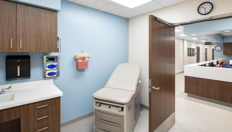 A former, vacant pizzeria was completely transformed to create a freestanding urgent care clinic for Mercyhealth System. From a drive-thru restaurant to a comfortable and functional healthcare environment serving the Dixon community, the unique space was revamped to include four exam rooms, a procedure room, imaging, lab, and support space.