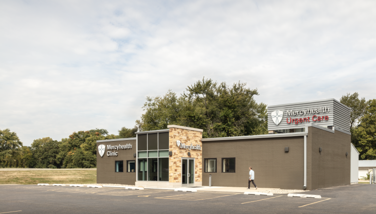 The project makes creative reuse of the existing 1957 facility, originally built as a radio station. A concrete structure that was previously used as a radio tower was maintained for signage. Along with updating the exterior to align with the Mercyhealth brand, the existing vestibule was removed to create a new, welcoming entry. The team also reworked the space for egress and code compliance, bringing the facility up-to-standard for regulations, comfort, and workflows.