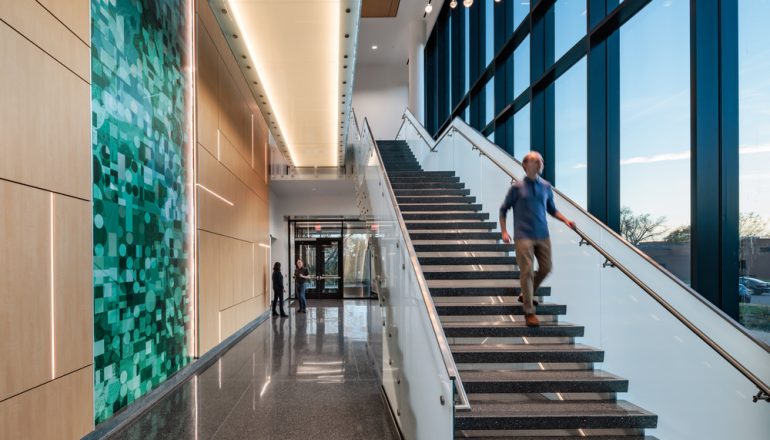 The new facility grows BRC’s capabilities for microbial cell production services, R&D, and consulting, and is intended to be the start of the new Biotech Quadrant on the Saint Paul Campus. Sustainability features include a solar-thermal wall, rooftop PV capabilities, expansion of district utilities, and B3 SB 2030 energy standard compliance. A custom two-story art installation incorporates scientific imagery at micro and macro scales, including cells, bacteria, algae, plant cross sections, neurons, and more.